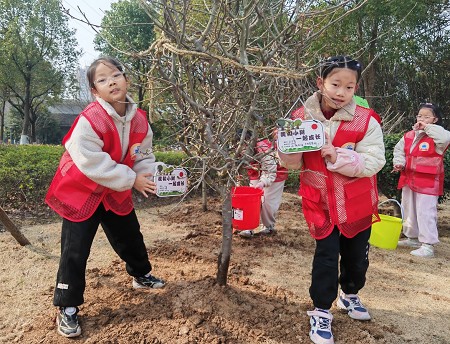 爸爸妈妈和孩子们密切配合,挖坑、扶苗、填土、浇水,爸一起种下一棵树,期待收获一片绿意。孩子们发挥创意与想象,为小树制作创意树牌,写上自己祝福和心愿,陪伴小树渐渐长大。俞清凌小朋友写下:“植一株新绿,予世界美好”,项茁和杨舒菡共同种下了一棵树,一起写下“希望小树茁壮成长 ”,邵诗涵为小树写下祝语:“快乐成长,永不褪色”,何沐宸精心制作了猫头鹰树牌,写下“爱绿护绿,从我做起”,陆泽勋在“爱心花朵”上写下:种下希望,收获未来……孩子们挂好树牌,激动地和小树合影留念,并表示会常来看望。