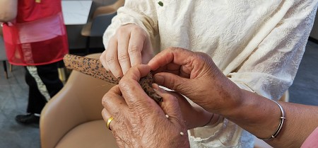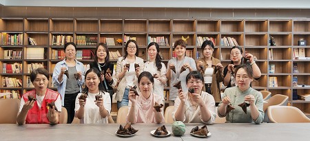 大家新奇地拿起箬壳,跃跃欲试。“这个粽叶有点好看,还是‘豹纹’图案呢”,现场欢声笑语不断。大家围坐成圈,在阿姨手把手的带领下,开始欢快地动手包粽子。“我的怎么缺了一个角”“老师,快快教我捆扎一下”“看着不难,怎么一上手,根本不是这么回事哈”,不禁自嘲,“还真是一看就会,一学就废”。大家三五成组,互相帮助,你争我赶,手法从生疏到日渐熟练,三角形、四角形、长条形粽子逐渐堆满托盘。现场很多员工都是好 次包粽子,谢阿姨一边教学一边感慨:“现在年轻人会包粽子的少了,开展这样的活动能感受节日氛围,也让宁波的老手艺传承下去。”