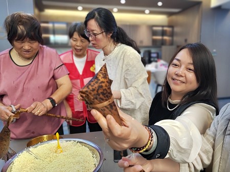 中午,全体员工在食堂一起品尝宁波特色碱水粽,传递节日温暖。如今各色粽子品类繁多,但在很多宁波人的心里,惦记的还是那只清清爽爽、棱角分明、有人间烟火的碱水粽,好常吃的方法就是蘸着白糖吃。大家在白糖“揾”粽子中,感受传统文化独特魅力。